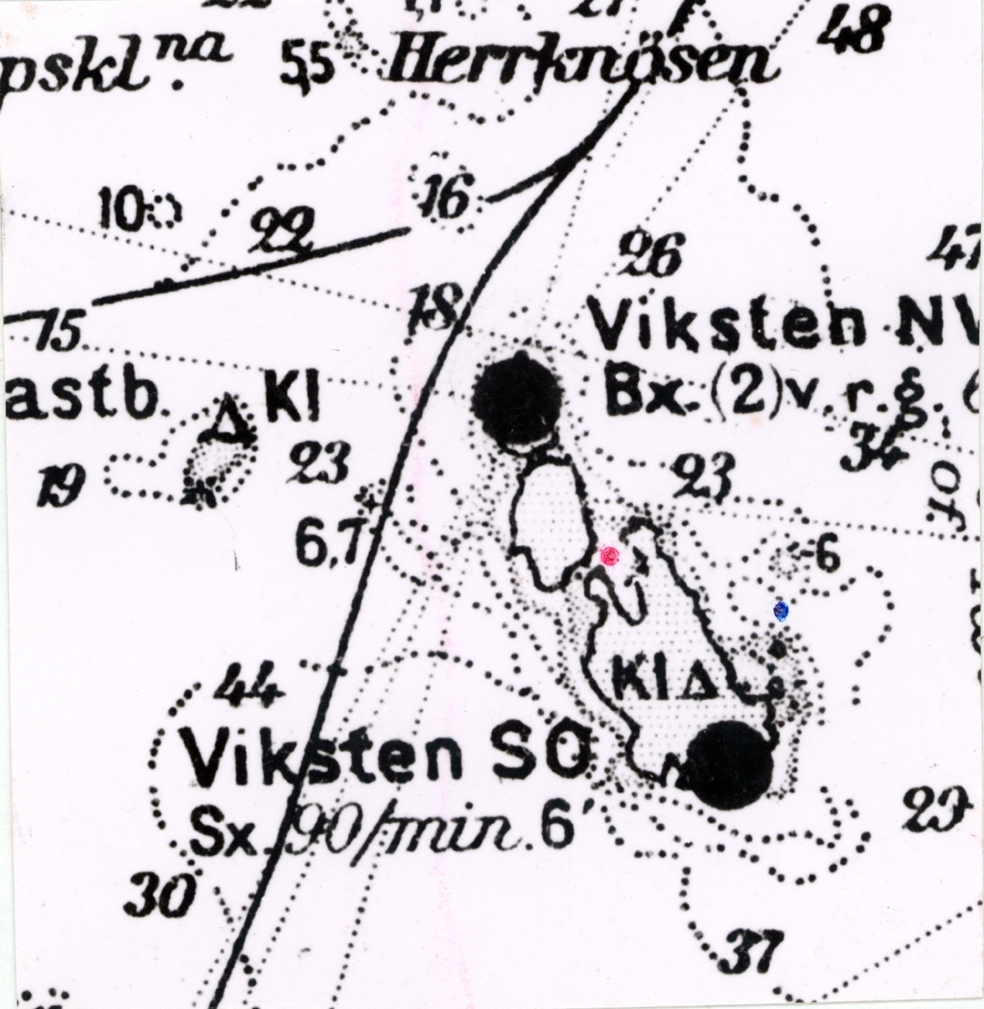 Bassängen med röd prick genomforskades 1953 utan resultat. 1954 fanns rester av Riksnyckelns vrak vid blå prick mellan 6 m grundet och det lilla skäret Lerknölen.