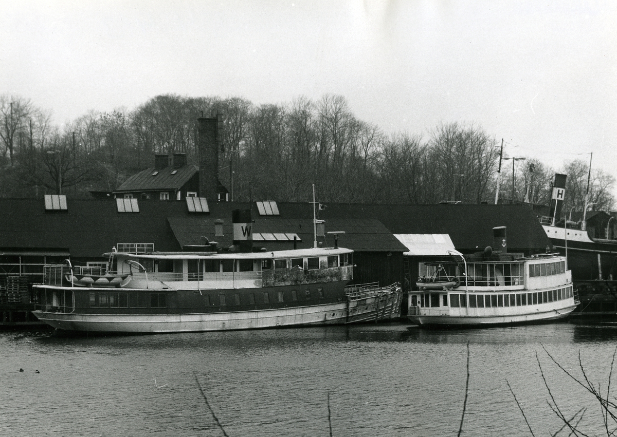 Foto i svartvitt visande Västan och Drottningholm för upprustning vid mälarvarvet, Stockholm, 1973-02.