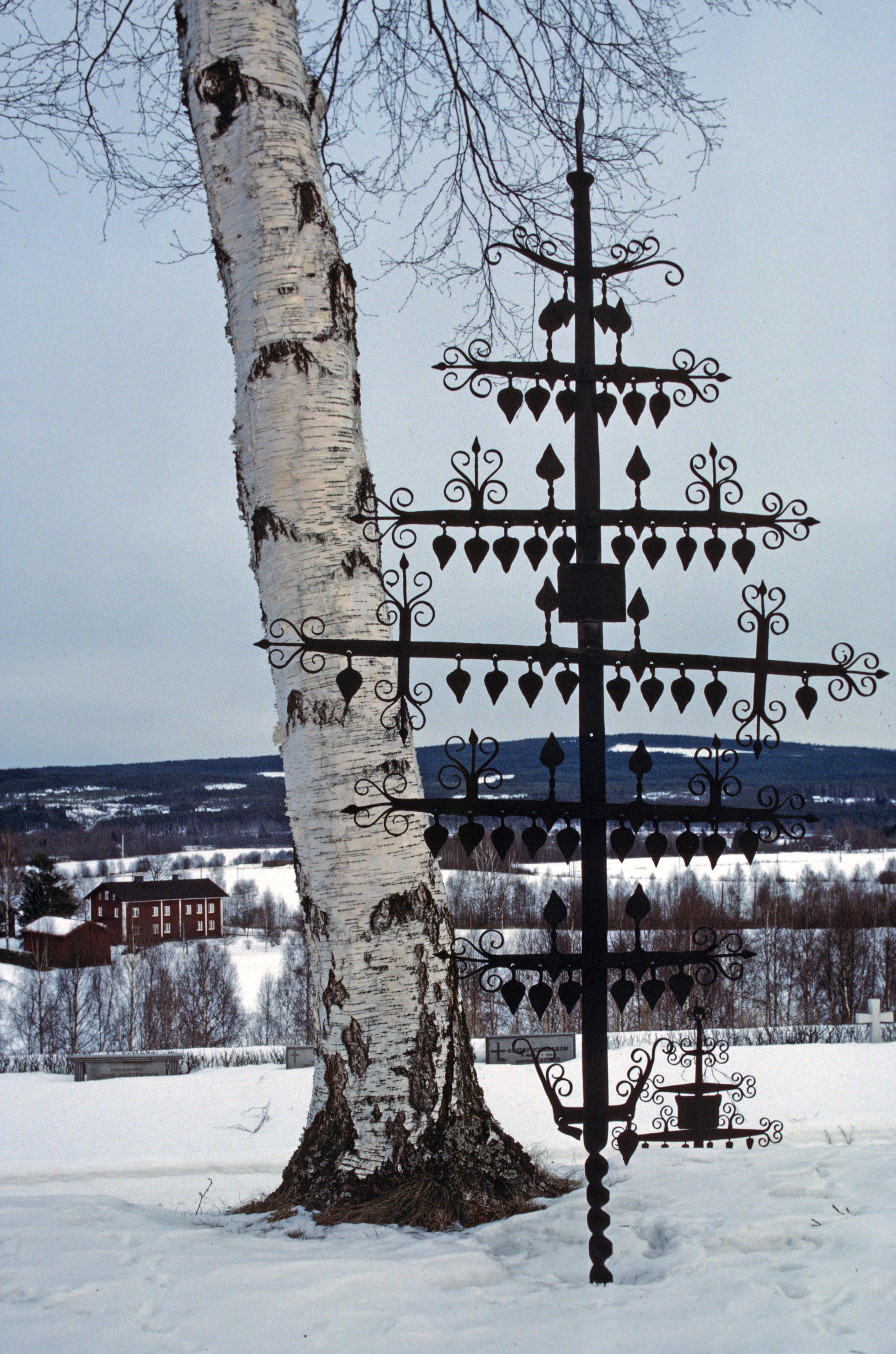 Beskrivning: Kyrkogården, smideskors. Bilden troligen från mitten av 1980-talet.