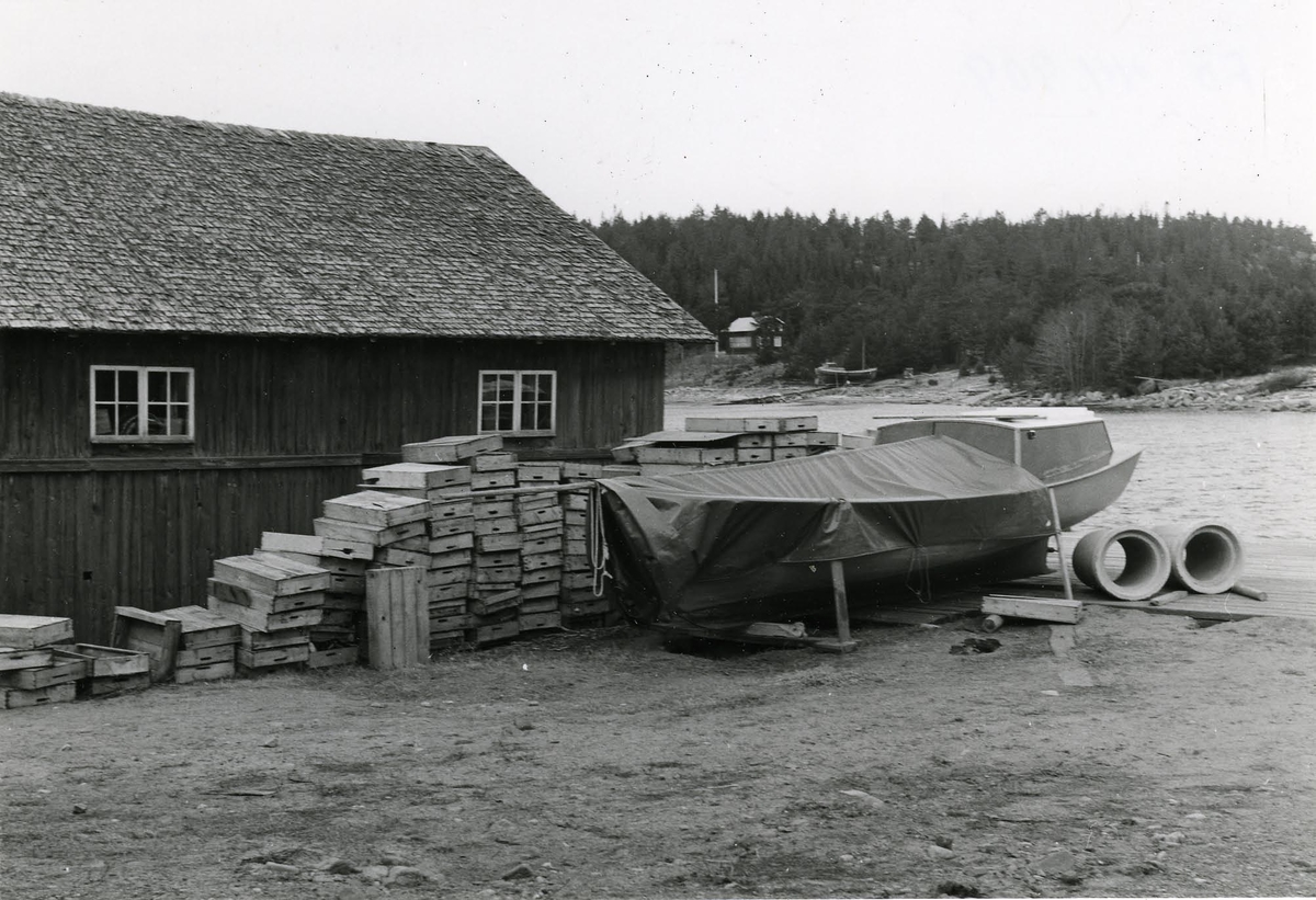 Ångermanland, Trysunda. Fiskaren Sten Allan Vågbergs båt upplagd för vintern på kajen. Båten är byggd av fiskaren och båtbyggaren Ola Lundgren.