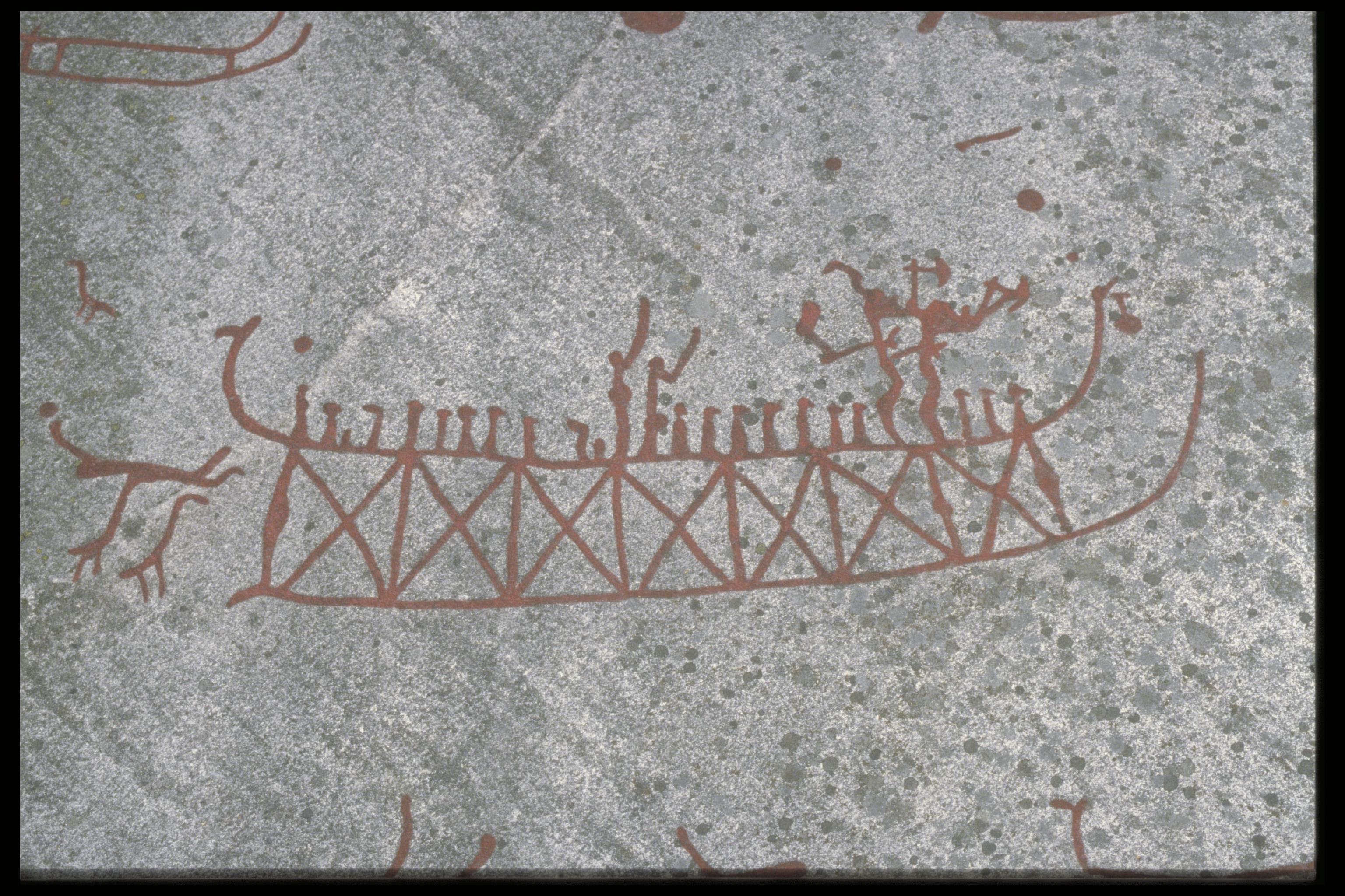 Skepp med krysstag, långa stävar och bemanningsstreck. Fyra större, ståendes människofigurer med höjda armar, varav två med seremoniyxor. Två tvåbenta djur. Vitlyckehällen, Tanum 1:1.