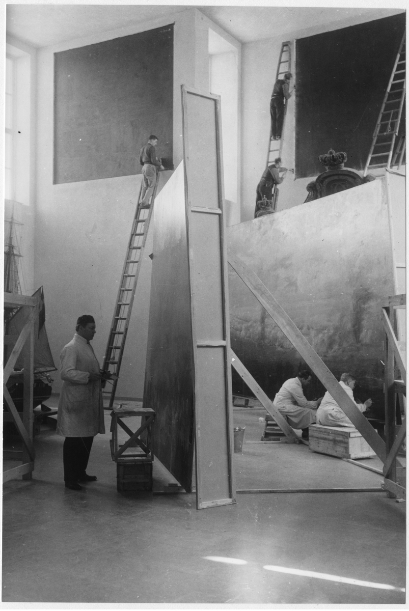 Konservator Janson vid restaureringen av Despreztavlorna i trofésalen.