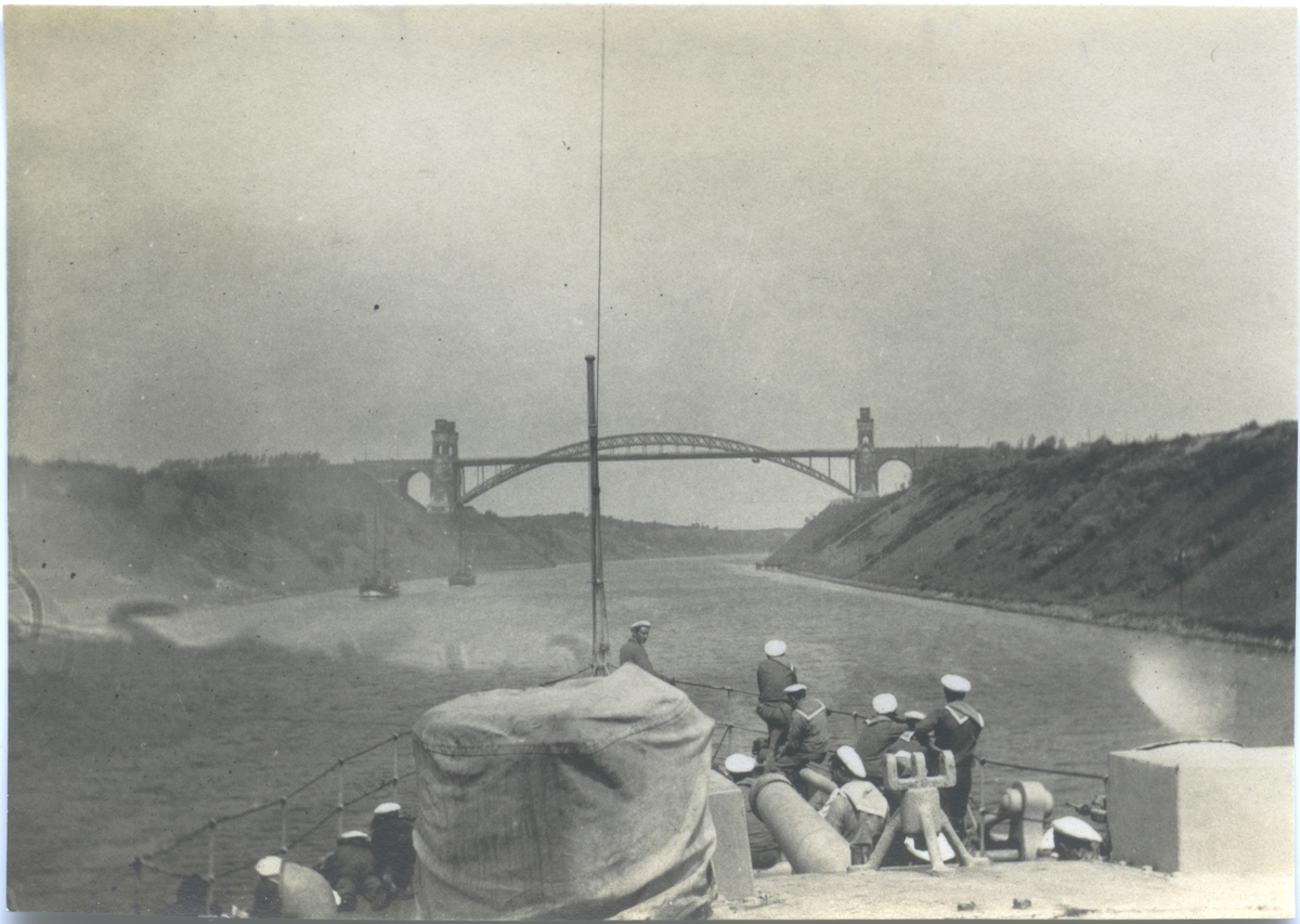 Pansarkryssaren FYLGIA i Kielkanalen. I bakgrunden järnvägsbron vid Levensau nära Kiel.