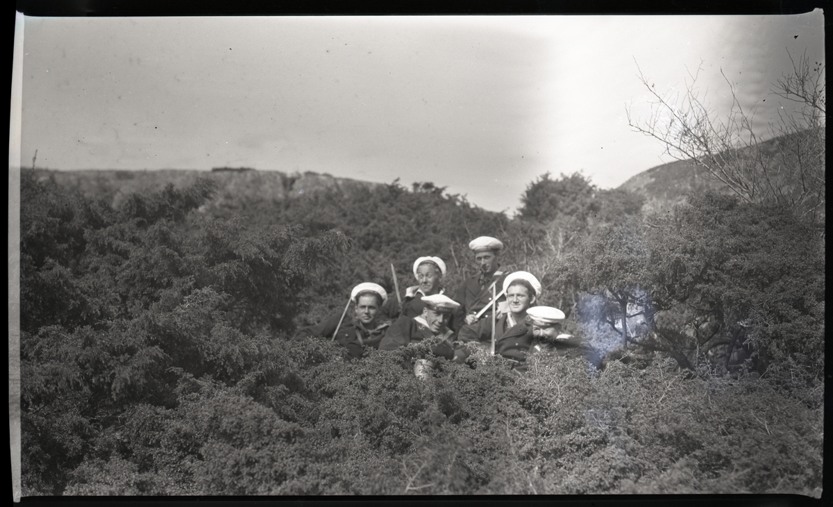 Sex militärer från pansarskeppet SVERIGE (mössmärkena) gömmer sig bland enebuskar. Andra bilder i Bergers samling tyder på att detta fotografi tagits vid stridsövningen på Stabbo i Stockholms södra skärgård 1929; detta har dock inte kunnat bekräftas.