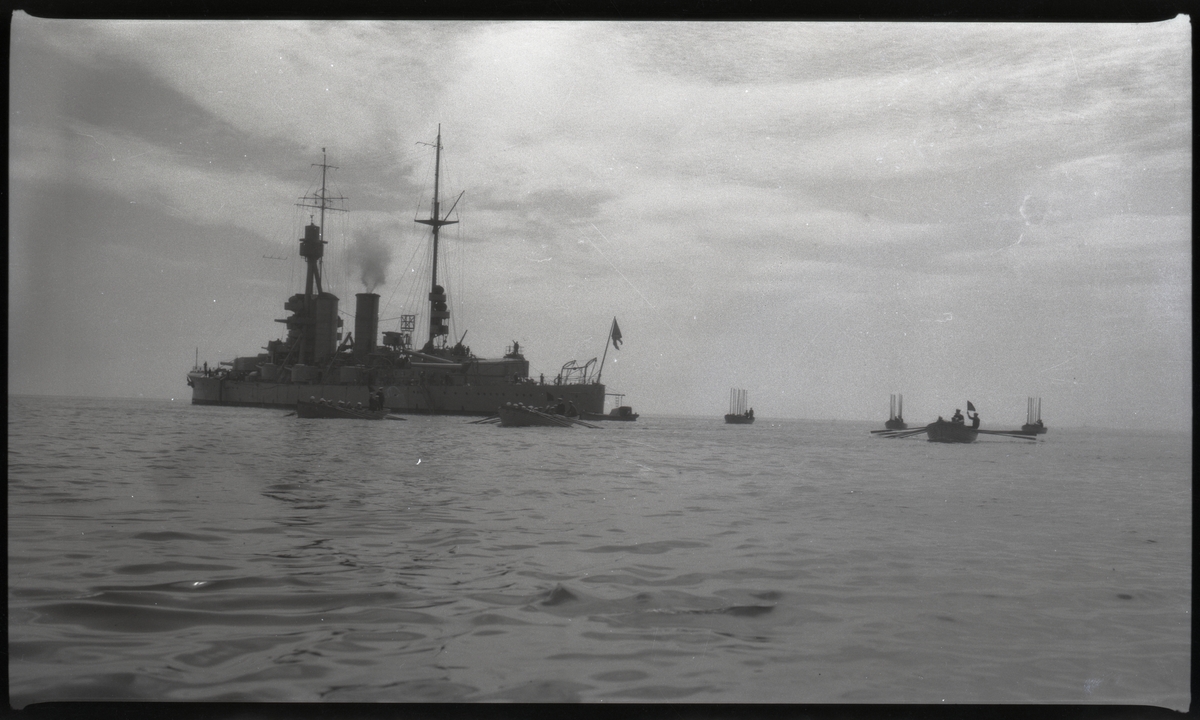 Pansarskeppet SVERIGE och slupar rodda av flottister. Jfr Fo229232C, Fo22956C, Fo229278C och Fo229280C, som uppenbarligen tagits vid samma tillfälle.