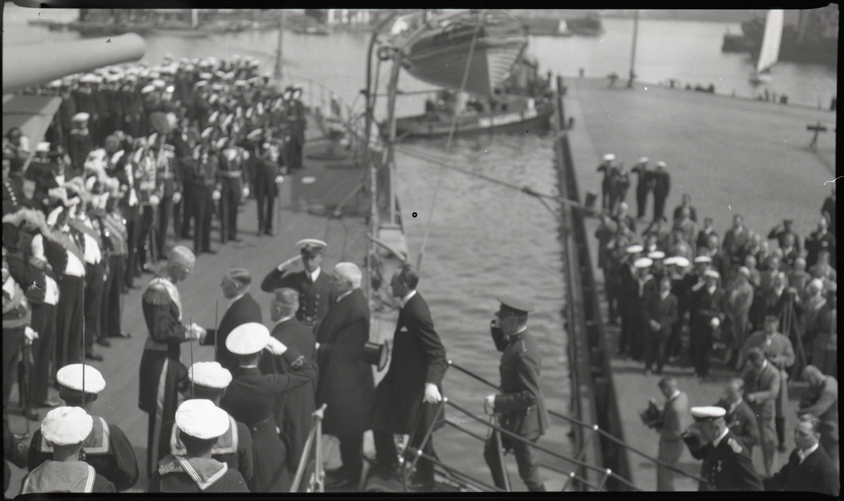 Från kung Gustaf V:s statsbesök i Estland 27 juni 1929; monarken hälsar på estniska representanter ombord på pansarskeppet SVERIGE i Tallinns hamn.