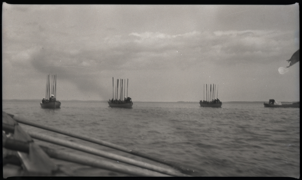 Slupar rodda av flottister. Jfr Fo229232C, Fo229234C, Fo229256C samt Fo229280C,som förefaller ha tagits vid samma tillfälle; om så är fallet hör örlogsflaggan i h kant till pansarskeppet SVERIGE.