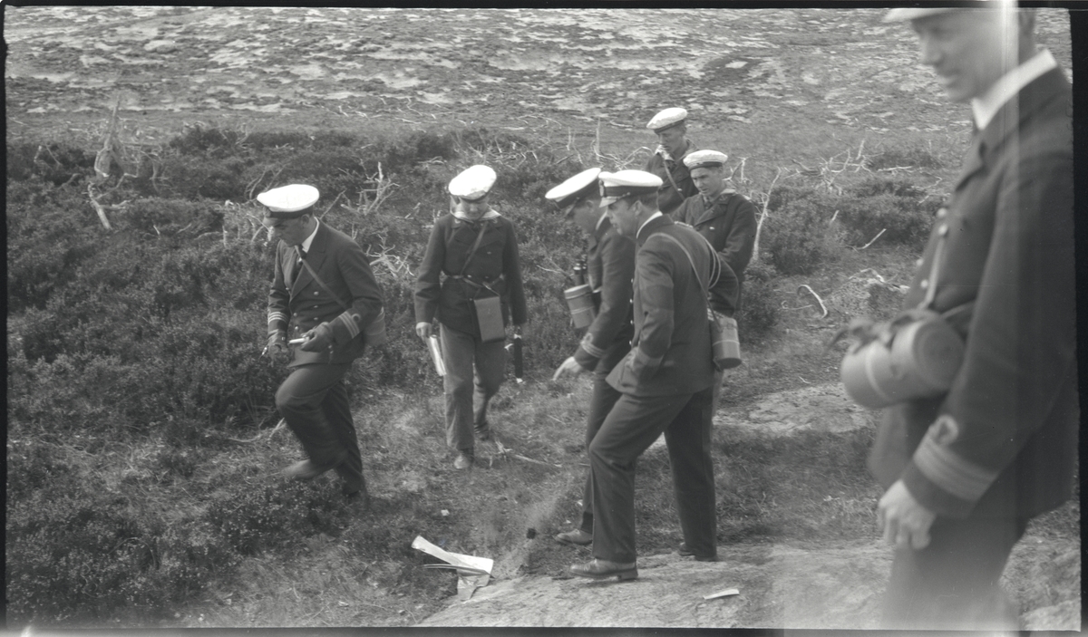 Stridsövning på Stabbo i Stockholms södra skärgård 1929; officerare och manskap i terrängen