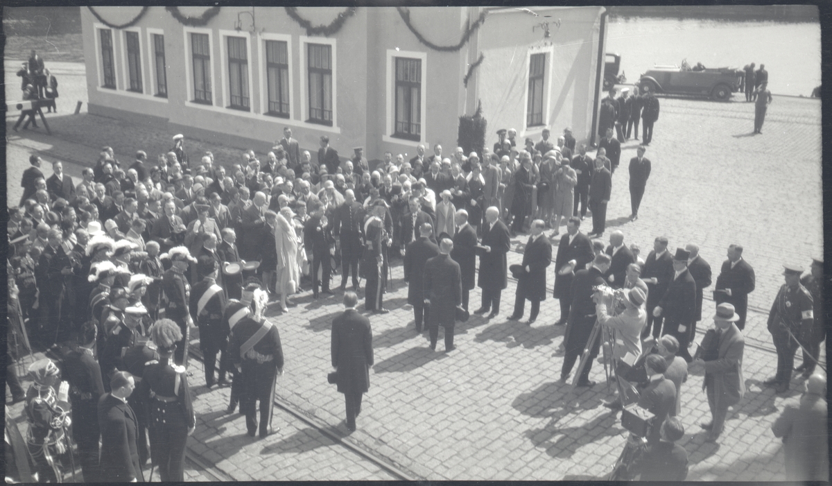 Kung Gustaf V tas emot i Tallinn under sitt statsbesök i Estland 27 juni 1929. Bilden är tagen från pansarskeppet Sverige, från vilket kungen stigit i land.