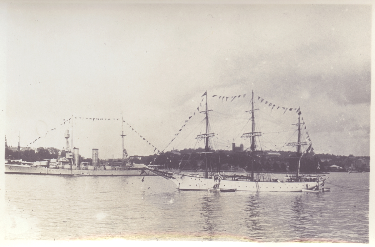 Oidentifierad 3-mastad fullriggare (skolfartyg?) i Stockholm; till v i bakgrunden pansarskeppet SVERIGE