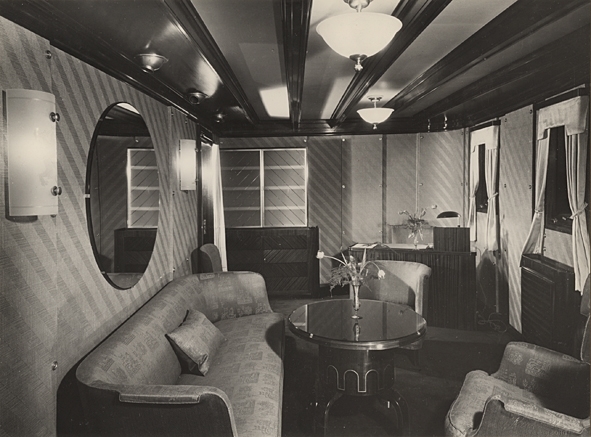 Redarvåningens salong sedd från styrbord mot babord. Väggar i blågrått siden. Möbler polerade, gråsvarta, klädda med blågult siden. Armatur och bokskåp med mattslipat ofärgat glas.