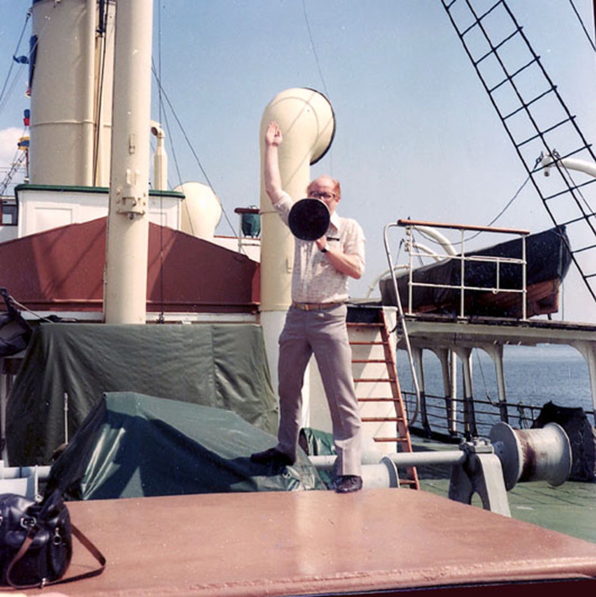 Man med ropare ombord på isbrytaren Sankt Erik.