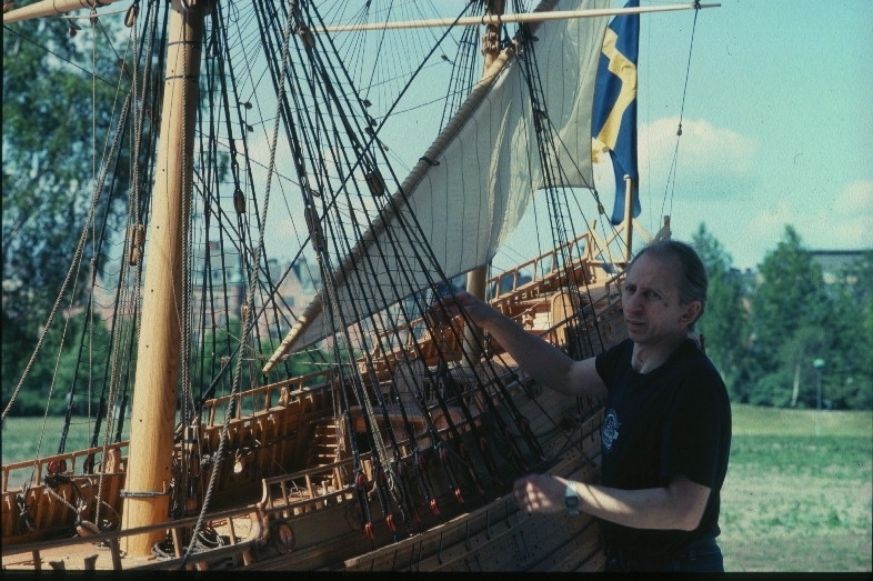 Modellkonservator Göran Forss med vasamodellen i skala 1:10 utanför nya Vasamuseet
