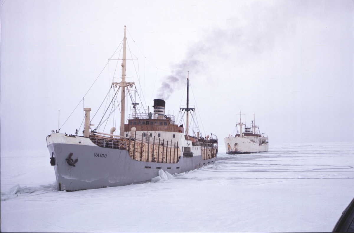 Lastfartyget Vaigu och Isis på väg genom isen. Fotade från Ymer.