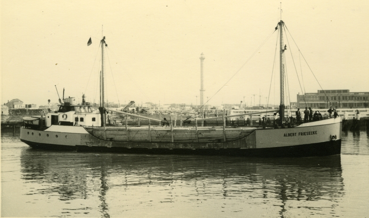 Titel: Ombyggd 1952 av Beidenflether Werft, Paul Peters, Beidenfleth, från läktare till motorfartyg. Ägare:/1952-57/: Ett partrederi Huvudredare: Adalbert Friesecke. Hemort: Rendsburg.