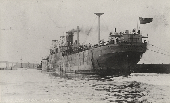 Foto i svarvitt visande lastångfartyget "EVERTON GRANGE" av Greenock. Fartyget under bogsering, troligen i Manchesterkanalen, England. Observera de nedtagna toppmasterna. Omkring 1909.