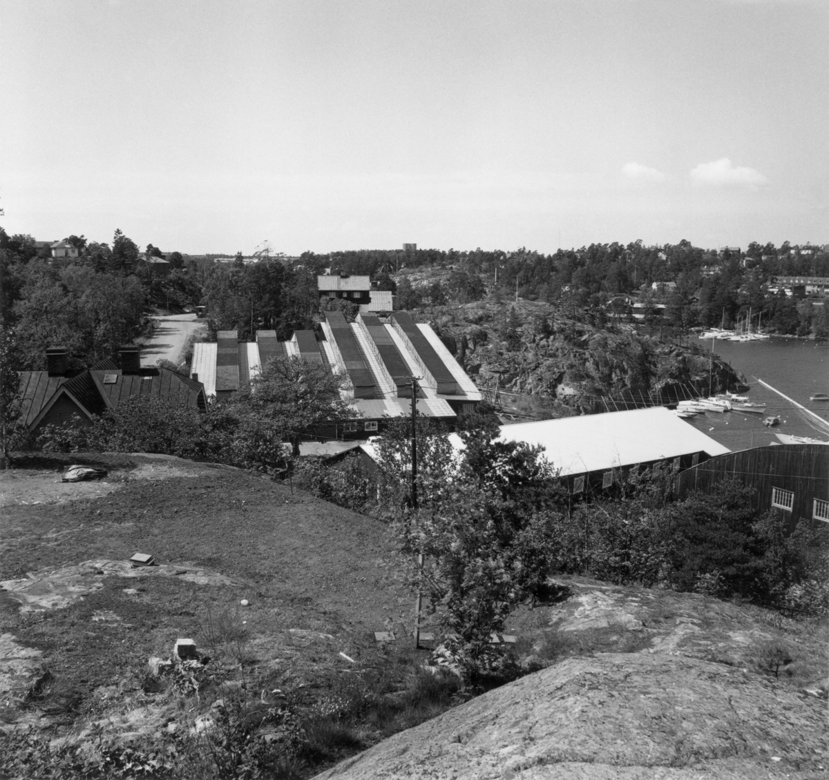 [från Fotobeskrivning:] "Översikt över Neglingevarvet, byggnader och skjul från SO. Till vänster byggnadsverkstaden med snickeri och smedja m.m."