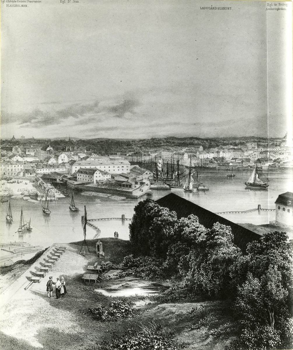 Utsikt mot Blasieholmen och Nybroviken från Skeppsholmskyrkans kupol.