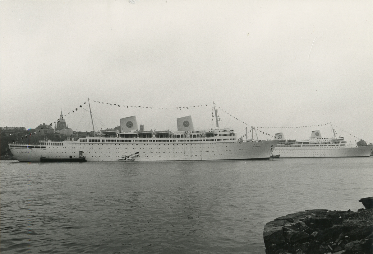 [på Fotobeskrivning:] "M/S GRIPSHOLM och KUNGSHOLM i Stockholm den 24 juli 1975"