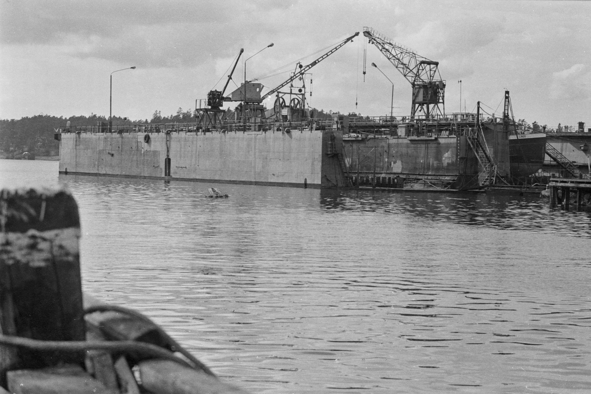 Ekensbergs varv 1970; varvskranar och flytdocka. Längst t h i stora dockan skymtar stäven på fartyget LINDÖ.