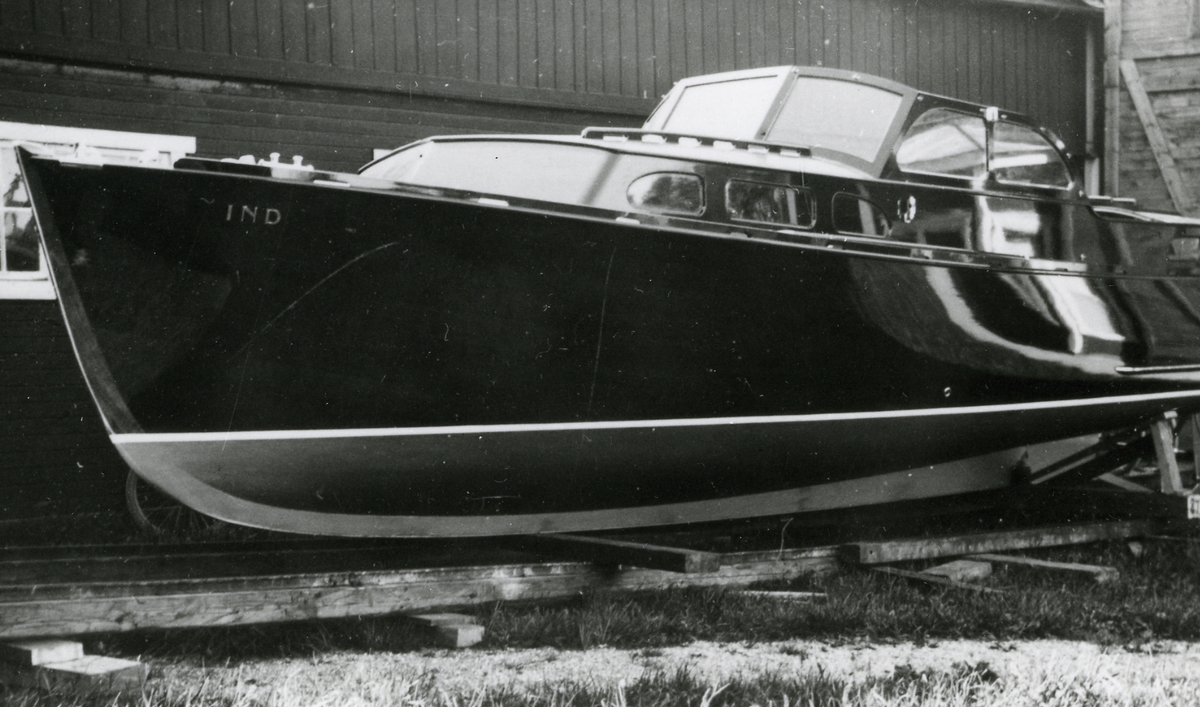 IND, tillverkad vid Fröbergs Båtvarv år 1939, tillverkningsnummer 87. Beställare: ing. G D Berglund.
