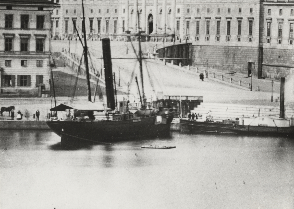 Hjulångaren WERMDÖ vid Slottet, Skeppsbron, Stockholm. Till vänster troligen HUDIKSVALL II. Fotografiet troligen från 1860-talets slut eller 1870-talets början.