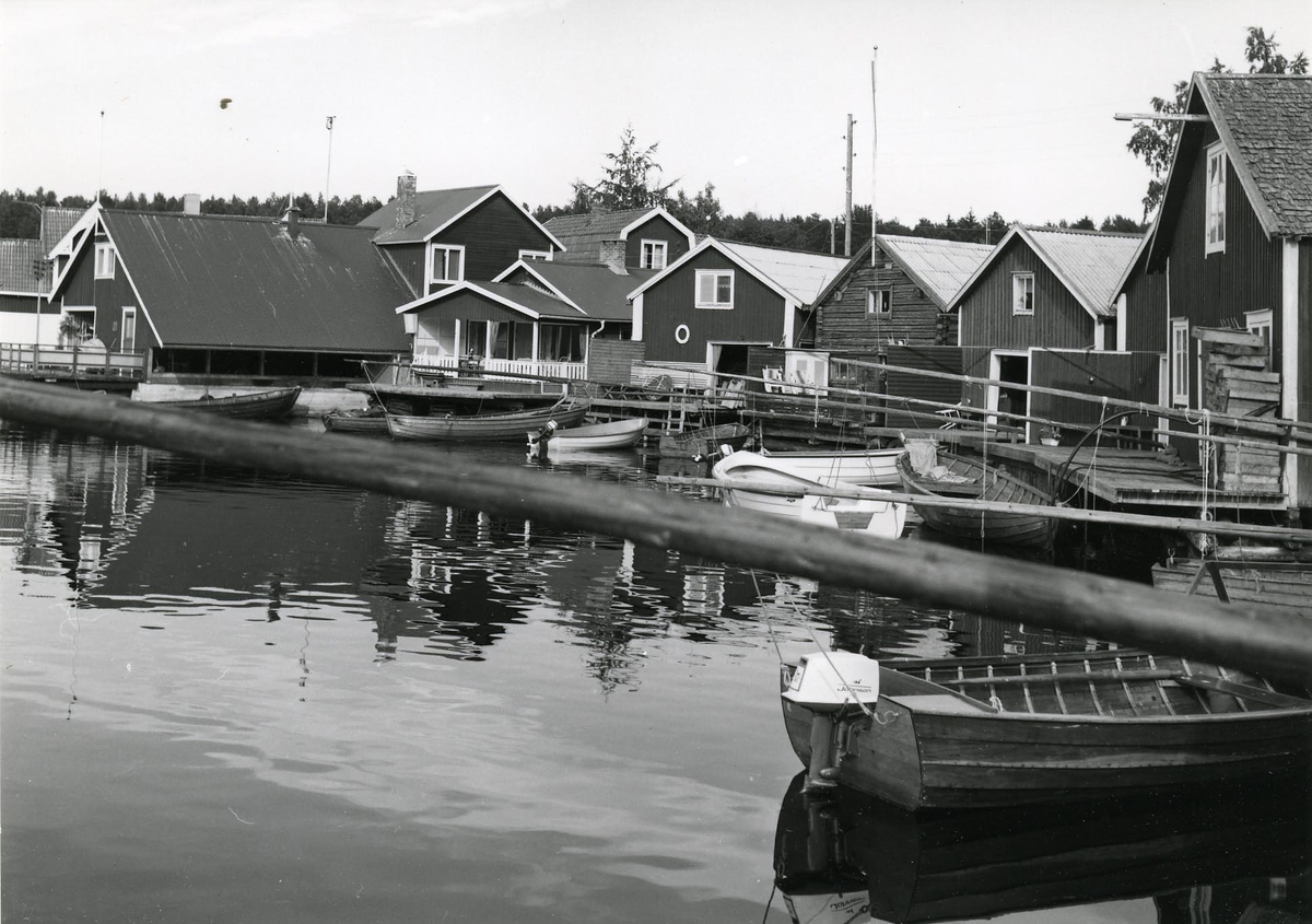 Ångermanland, Nordingrå sn. Sjöbodar i Norrfällsvikens fiskeläge. Här finns fyra - fem aktiva yrkesfiskare. En betydelsefull näring har turismen blivit för fiskeläget. En del av sjöbodarna har som synes byggts om för bostadsändamål.