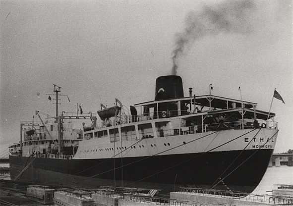 Foto i svartvitt visande tankmotorfartyget "ETHALI" av Monrovia vid kaj i Värtahamnen 1971-11-04.