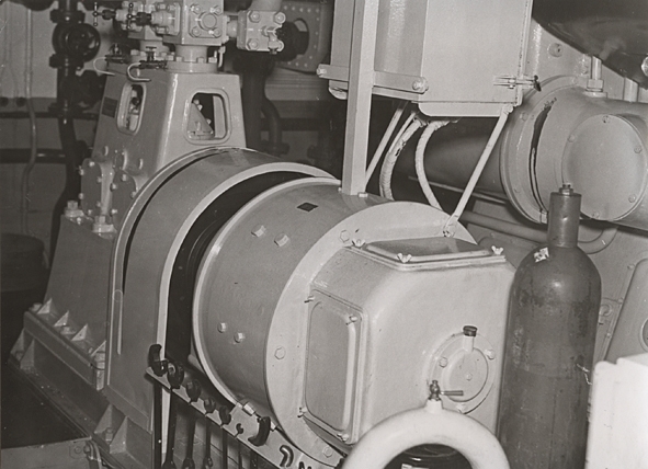 Titel: Lastmotorfartyget FIDRA av Stockholm, b. 1939. Lastrummet. Kylmaskineriet.