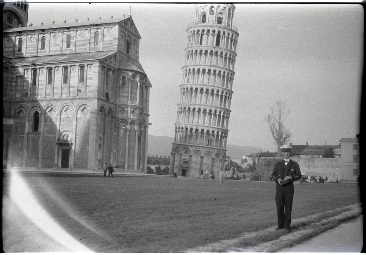 Svensk sjöofficer (fänrik) poserar framför det lutande tornet i Pisa. Mannen är sannolikt Gunvald Berger själv. Msn kan förmoda att bilden tagits då Berger 1925-1926 deltog i pansarkryssaren FYLGIAs långresa, varvid Genua angjordes.