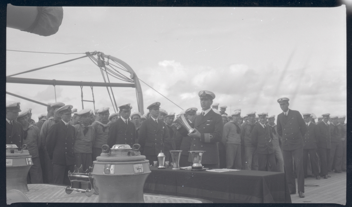 Fartygschefen på pansarskeppet SVERIGE, kommendörkapten Mörner, delar ut idrottspris på däck. Berger har skildrat prisutdelningen även på Fo229124A, Fo229156, Fo229193A, Fo229255C och Fo229258C.