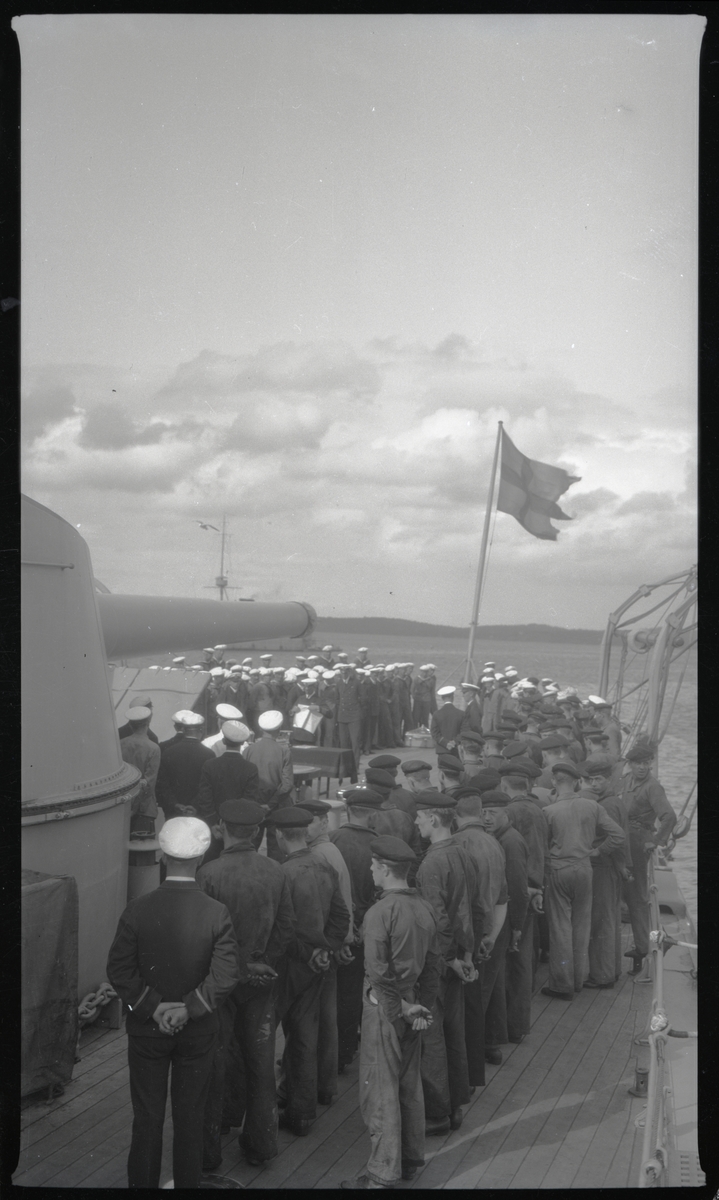 Fartygschefen på pansarskeppet SVERIGE, kommendörkapten Mörner, delar ut idrottspriser på däck. Berger har skildrat prisceremonin även på Fo229124A, Fo229156, Fo229193A, Fo229252C och Fo229258C.
