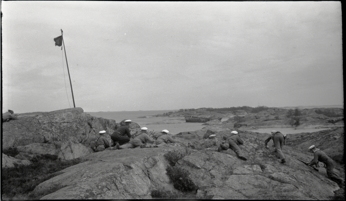 Stridsövning på Stabbo i Stockholms södra skärgård 1929; militärer med handeldvapen ligger på klipphällar och siktar mot fartygsvrak (skjutmål?) i bakgrunden.