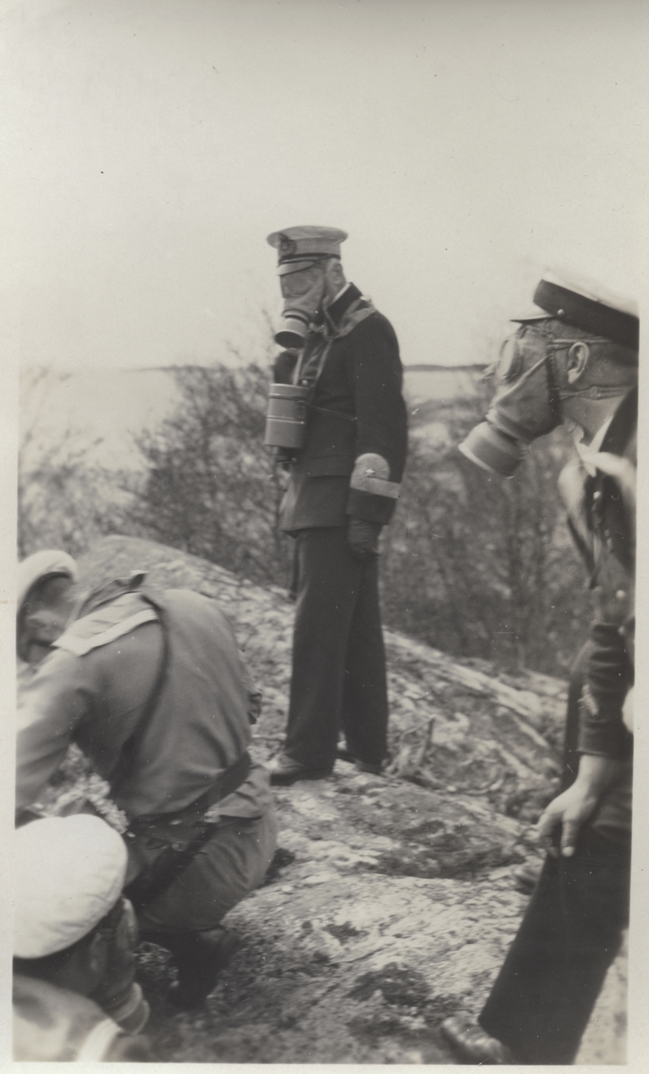 Officerare och manskap under stridsövning med gasmask. Andra bilder i Bergers samling tyder på att detta fotografi tagits vid landstigningsövningen på Stabbo i Stockholms södra skärgård 1929.
