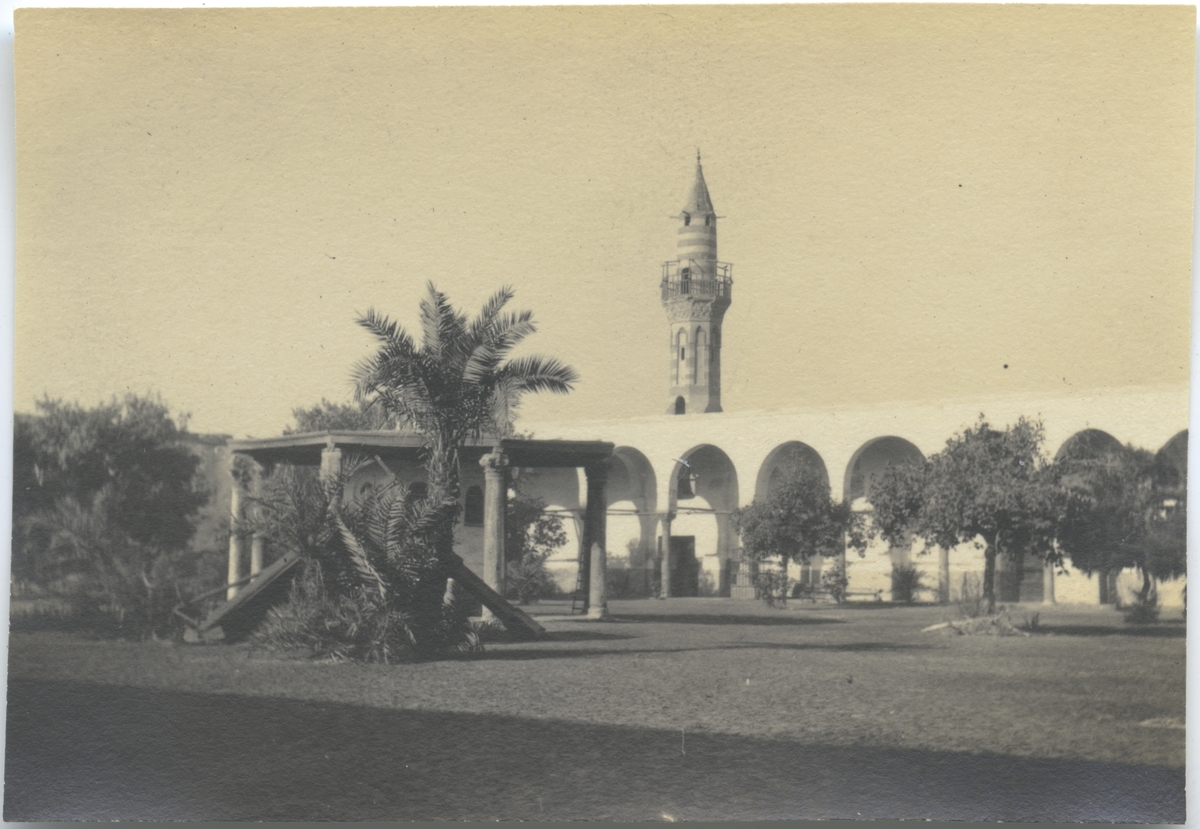 Okänd byggnad samt minaret. Bilden har sannolikt tagits då Berger medföljde pansarkryssaren FYLGIA på dess långresor 1925-1926 och 1927; vid den första resan angjordes bl a Alexandria och Tunis och vid den sistnämnda Alger. Vilken av dessa orter som ses på bilden har dock inte kunnat fastslås.