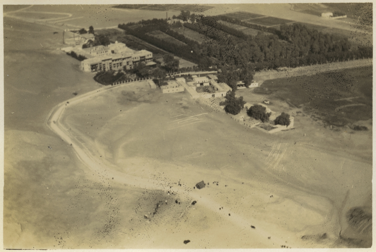 Bild högt uppifrån (flygbild?) över fält, väg och oidentifierad byggnad. Stämpeln på kopians baksida ("Hasselblads") och bruket av Velox fotopapper är gemensamt med flera av bilderna i Bergers samling från långresan med pansarkryssaren FYLGIA 1925-1926; att även denna bild tagits under denna resa har dock inte kunnat bekräftas.