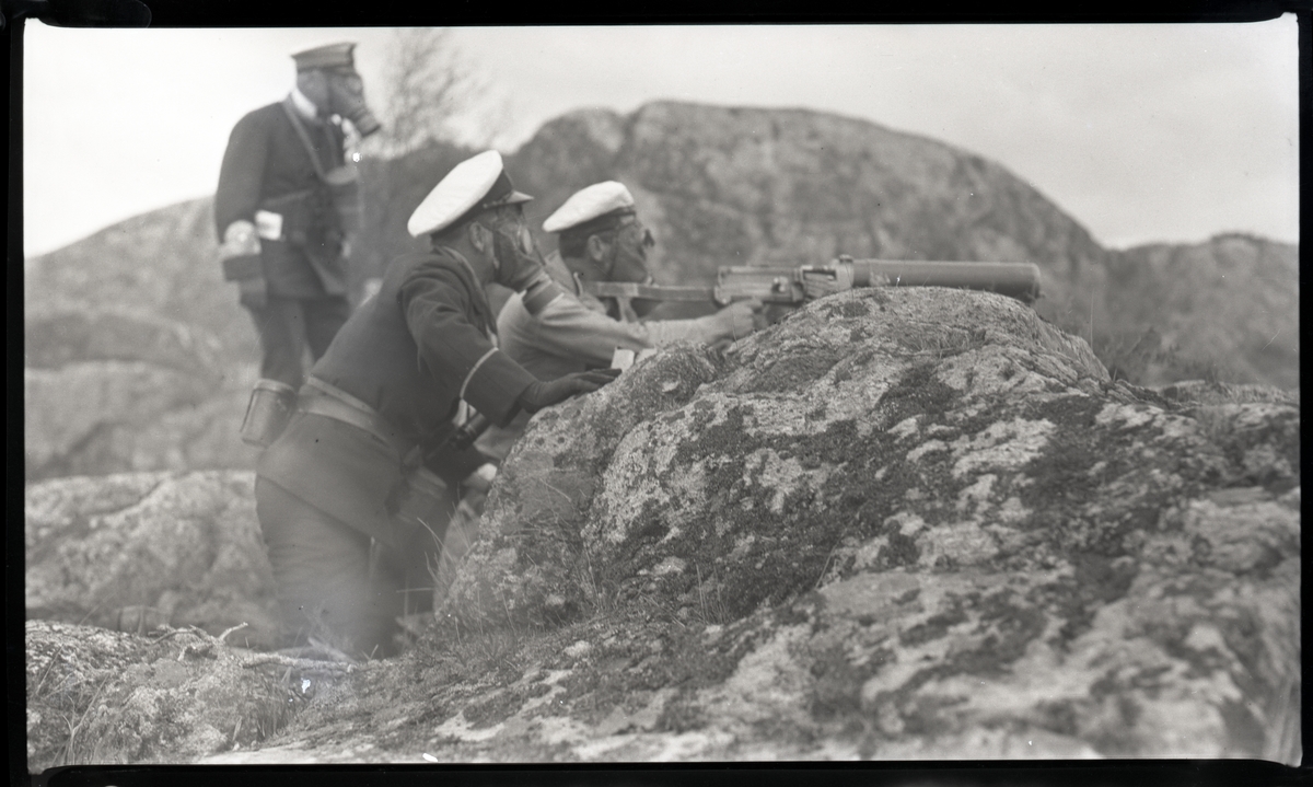Tre militärer i gasmask bemannar kulspruta i skärgårdsterräng. Andra bilder i Bergers samling tyder på att detta fotografi tagits då manskap från pansarskeppet SVERIGE 1929 deltog i stridsövning på Stabbo i Stockholms södra skärgård; detta har dock inte kunnat bekräftas.