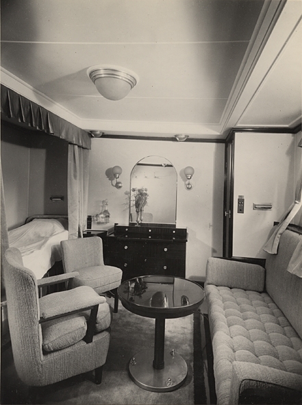 Hytt nr. 1. Förligast om styrbord, sed akterifrån. Taket vitt, gardiner och sänggardiner beigefärgade, matta grå med svartbrun bård, polerade möbler i mahogny. Badrum: kar och handfat samt klosett svagt gröna, golv smårutigt svart och vitt. Hytterna om babord ha rödlila badkar, om styrbord gröna.