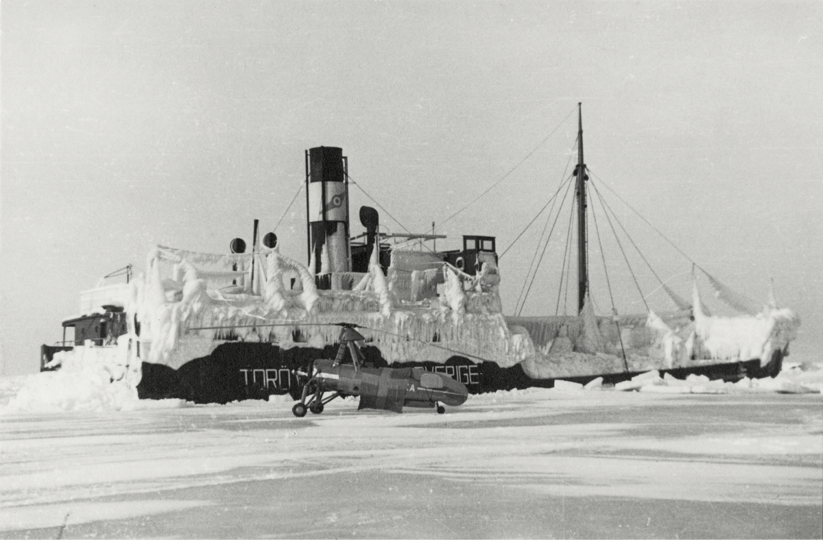Lastångfartyget TORÖ av Stockholm. Minsprängt den 12.12.1939 vid Falsterbo. Obs. att akterskeppet brutits loss av isen. Framför fartyget v. Bahrs autogiro.