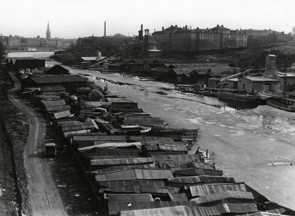 Klara sjö sedd från S:t Eriksbron med upplagda småbåtar på kajen till vänster. I bakgrunden Kungsholmsbron och längst bort Klara kyrktorn.