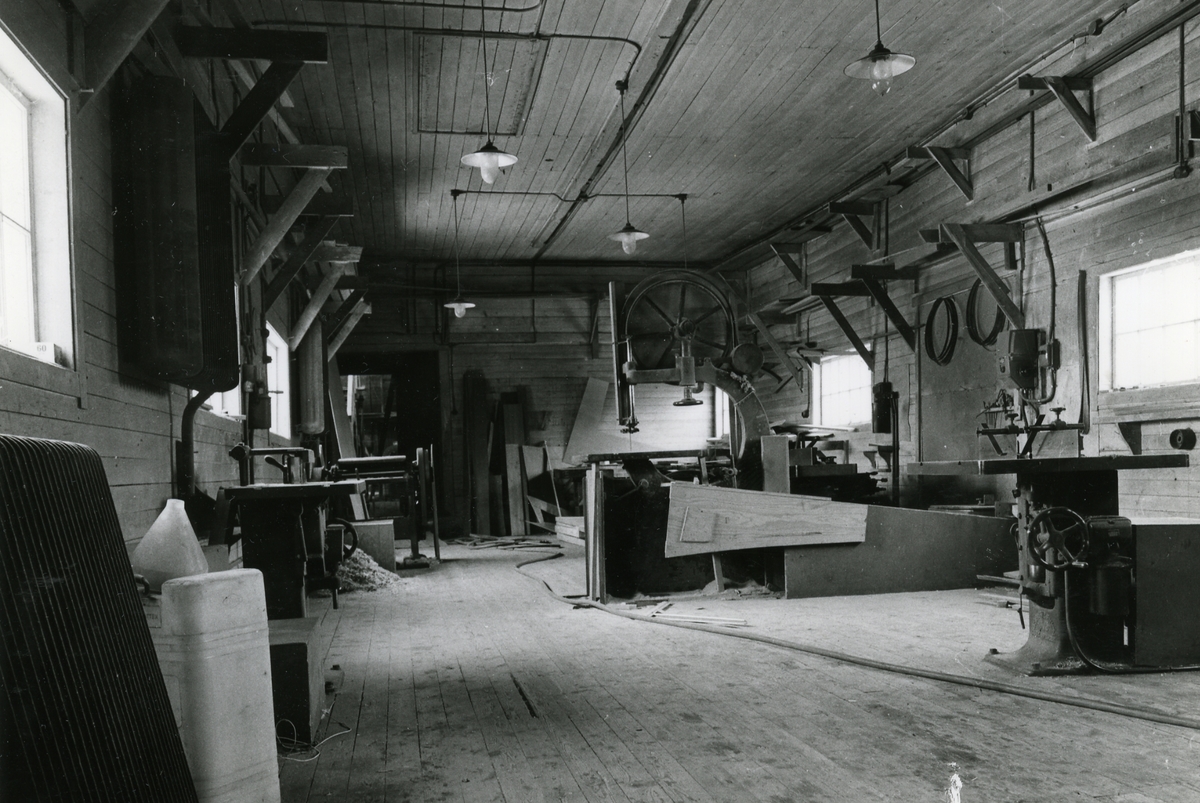Snickarverkstaden, gamla båtbyggarverkstaden. Mått: 14 x 6 meter. Det var här Fröberg började bygga båtar då han köpte nuvarande varsbyggnaden år 1923. Tidigare hade byggnaden varit stall. När den nya verkstaden byggdes år 1930 blev här maskinverkstad. Då inköptes följande maskiner (från vänster): fräs, planhyvel, bandsåg och rikt hyvel.