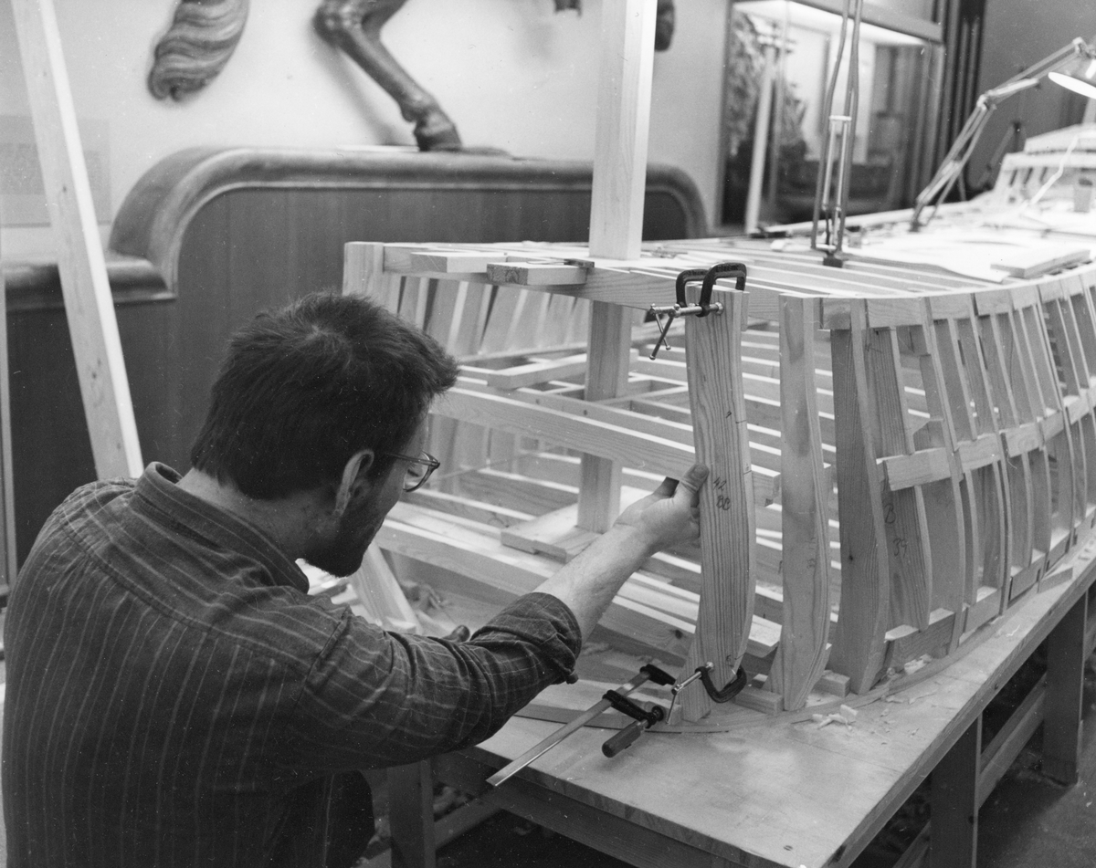 Modellbyggare Lars Eriksson i arbete med modellen av Vasa i skala 1:10.