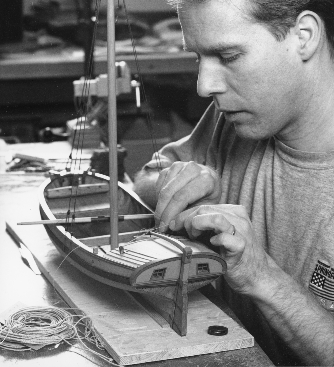 Modellbyggare Stefan Bruhn arbetar med en modell av en mälarjakt (SM 28083).