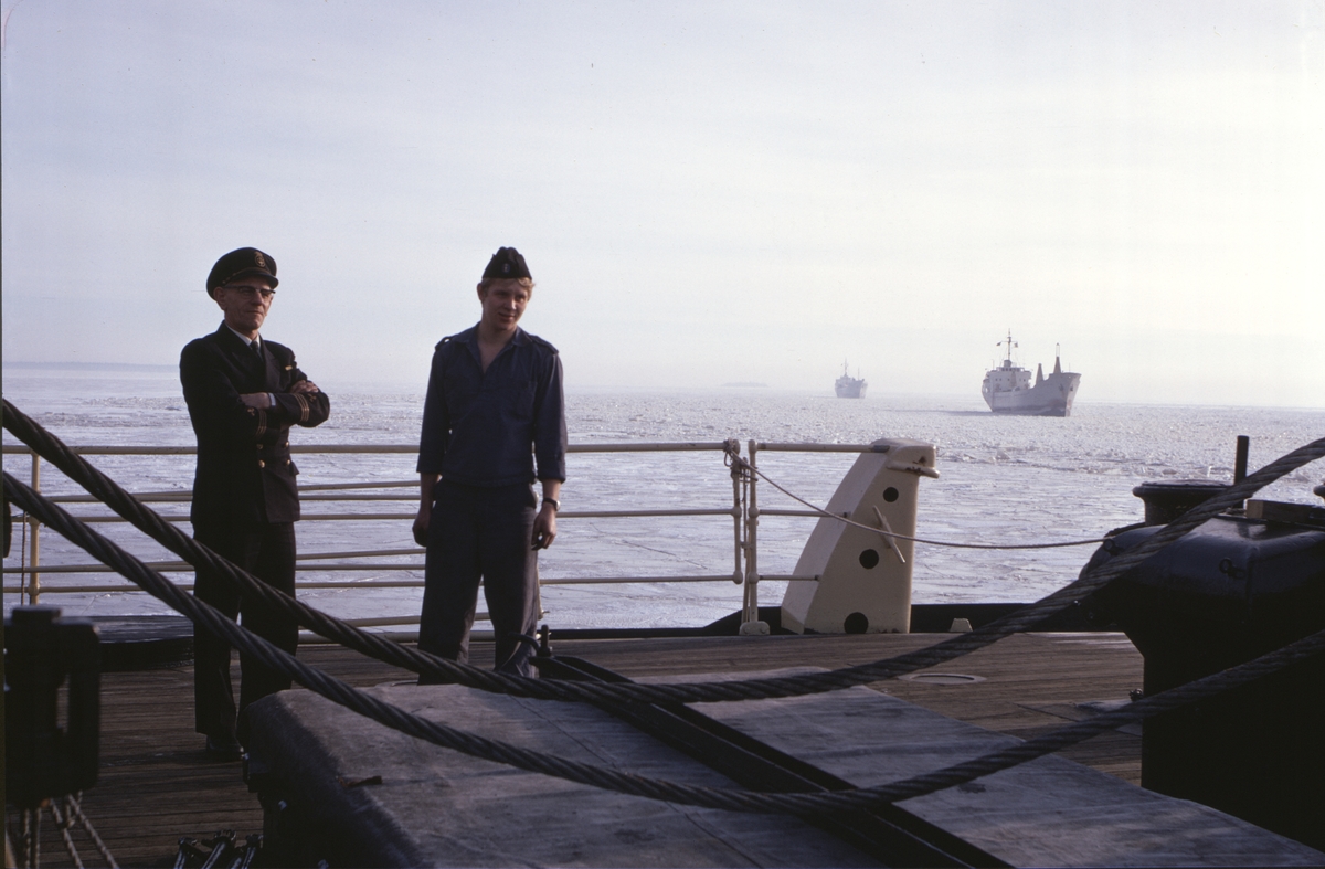 Besättningsmedlemmar poserar på däck med ett par lastfartyg i bakgrunden som verkar ha fastnat i isen.