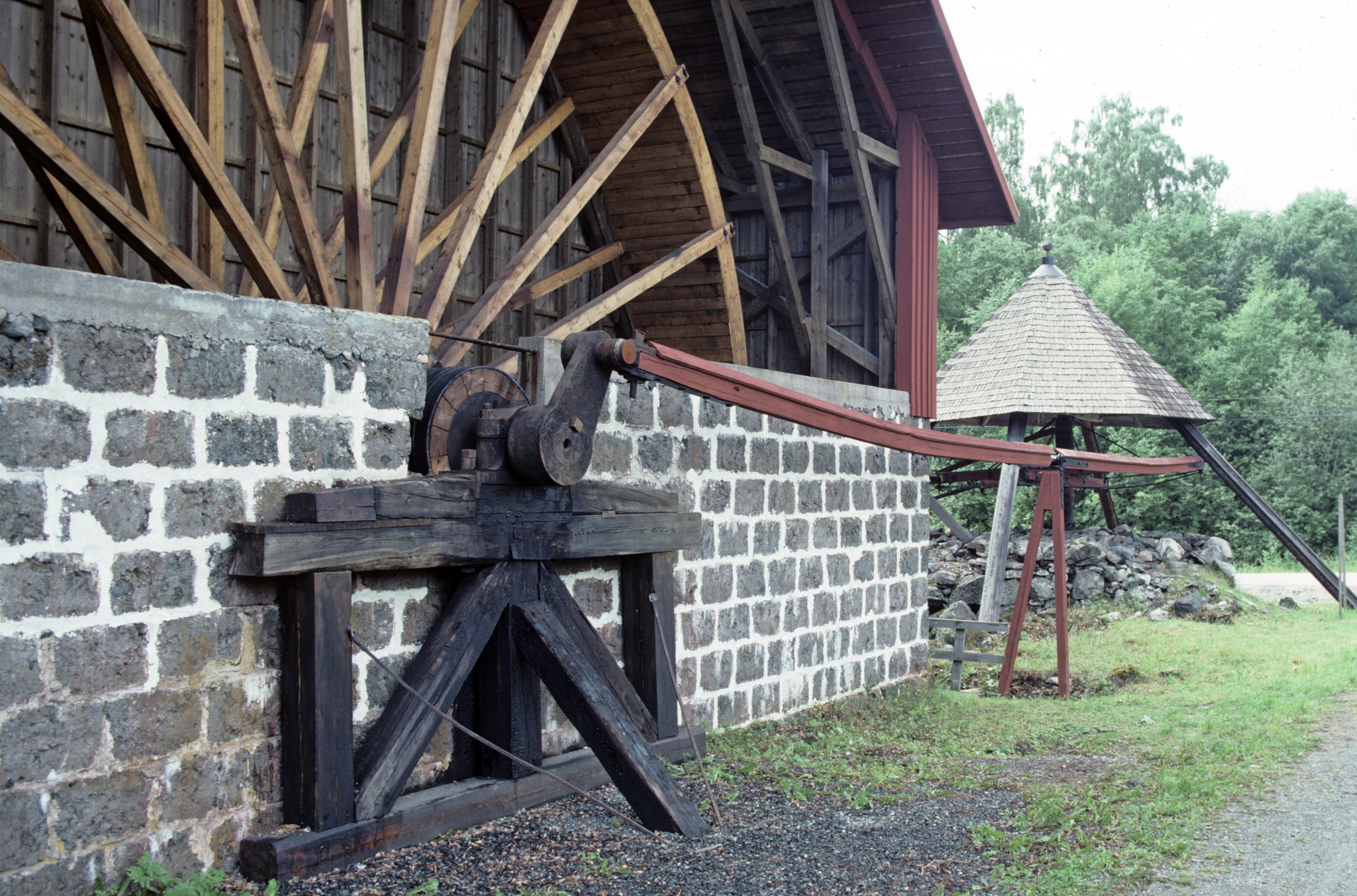 Tabergs konsthjul. Konstgång (upphängda pendlande trästänger). Bilden troligen från mitten av 1980-talet.