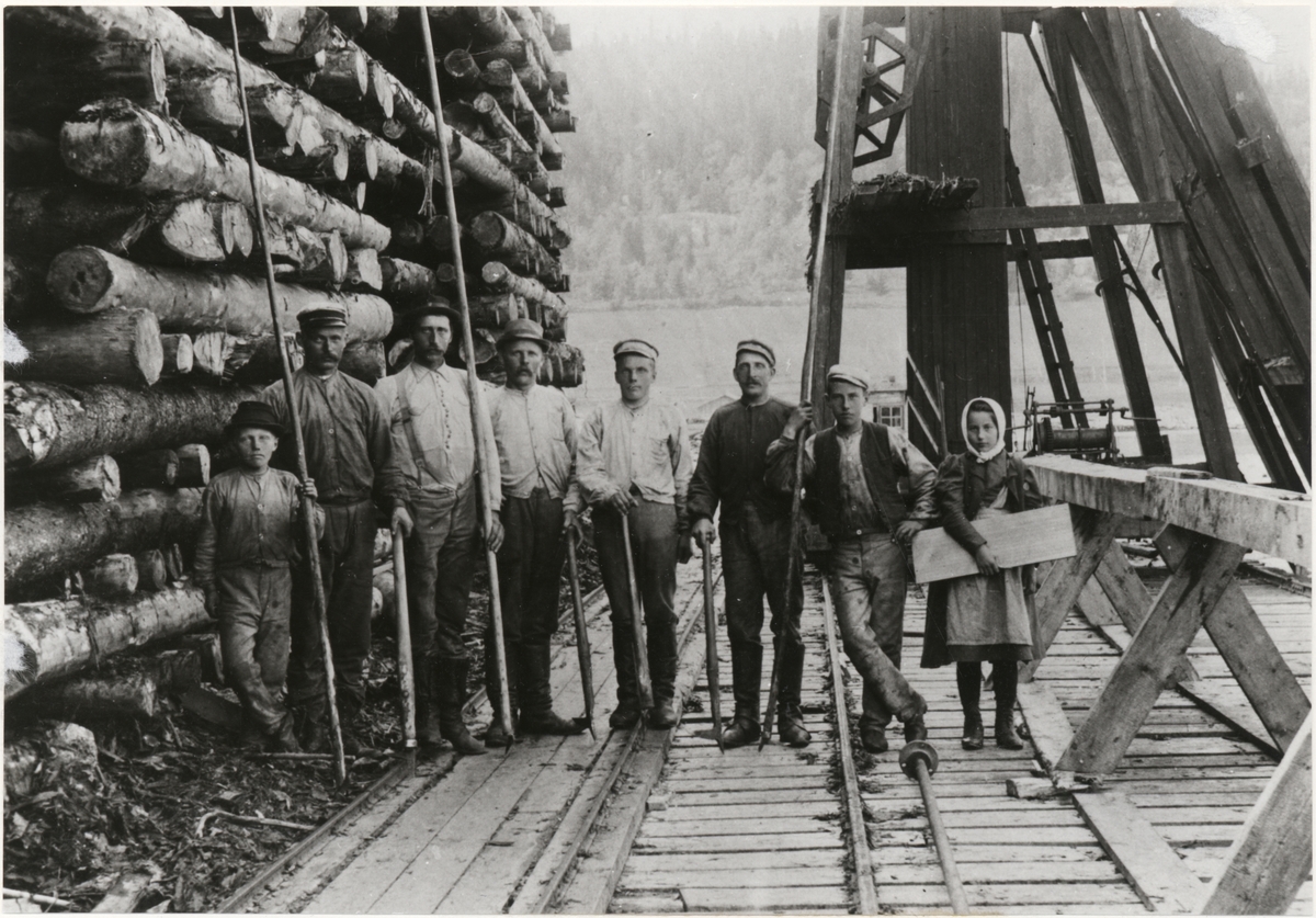 [från fotobeskrivningen under rubriken Motiv/Innehåll:] "Här ses arbetslaget vid Sprängvikens sågverks timmeruppfordring eller timmerhiss. Timret lades här upp för sågens vinterbehov, ett tungt och blött arbete. Flickan har en brädbit att anteckna antalet stockar på. Bilden bör vara tagen kring sekelskiftet 1900." [under rubriken Källa/Hänvisning:] "Erik Byström Box Strinne 455 870 26 Bjärtrå"