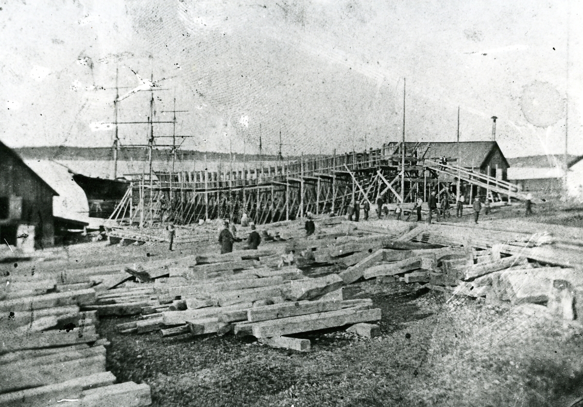 "Svenska skeppet INDIEN, då nybyggt, under upptackling utanför stapelbäddarna på varvet i Västervik våren 1863 eller möjligen hösten 1862. INDIEN afseglade på sin första resa den 28 mars 1863 under befäl af kapten J. G. Lagus." (Överstelöjtnant Erik Frumerie, Stockholm, 1943.)