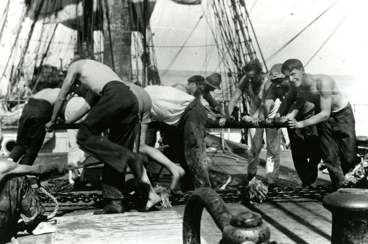 [från fotobeskrivningen:] "Ombord på C B PEDERSEN av Göteborg. I gångspelet på backen."
