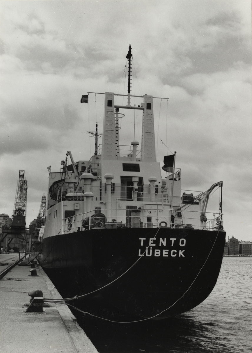Det tyska lastmotorfartyget TENTO liggande i Stadsgården Stockholm 1970. Fartyget såldes av Ångfartygs AB Tirfing den 24.10.1969.