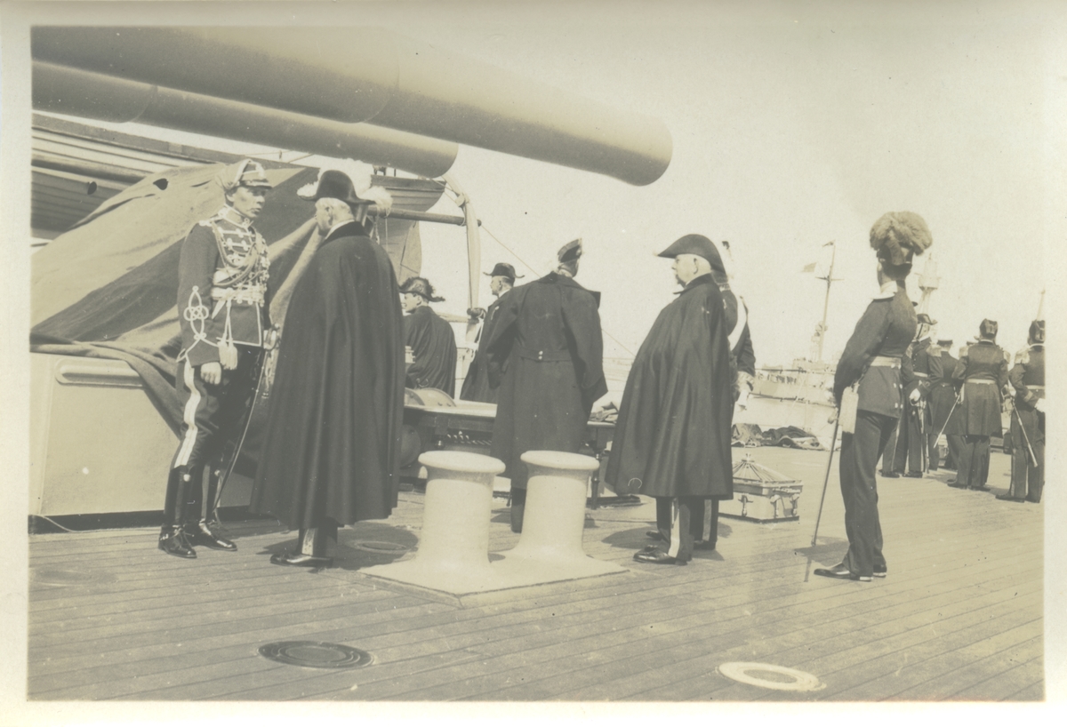 Officerare i paraduniform ombord på större örlogsfartyg, sannolikt pansarskepp. Mannen till v bär uniform vars nationalitet inte kunnat utrönas. Bergers samling innehåller bilder från såväl kung Gustaf V:s statsbesök i Tallin och Riga 1929 och den lettiske presidenten Zemgals besök i Stockholm samma år; det är möjligt att även Fo229140 tagits vid något av dessa tillfällen.